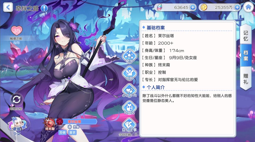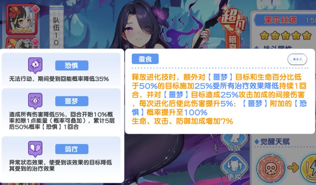 2、在【减能】能力上,茉尔丝塔在一众控制少女中算比较强的水平,比起进化种的部分控制少女略可能要稍逊色一筹,不过茉尔丝塔的部分减能其实能算是汲取能量,根据小分队相对论,我方回能就等于对方减能,那么汲取一点能量就相当于对方减2点能量,如果把这个也算上,那倒也不差。还有就是来自【噩梦】的概率减能和来自【恐惧】的降低35%回能概率。