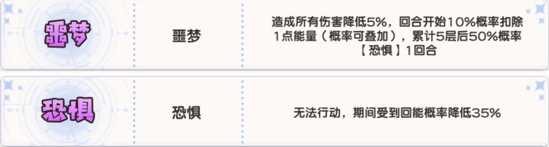 5、因为初始【噩梦】是可以持续三回合的,所以哪怕已经五层触发了【恐惧】,【噩梦】的层数也不会消失,而是继续维持在五层,但【恐惧】效果只有一回合,下回合哪怕【噩梦】还显示五层也难以进入【恐惧】状态,想要再次施加【恐惧】效果需要再次叠加五层新的【噩梦】。