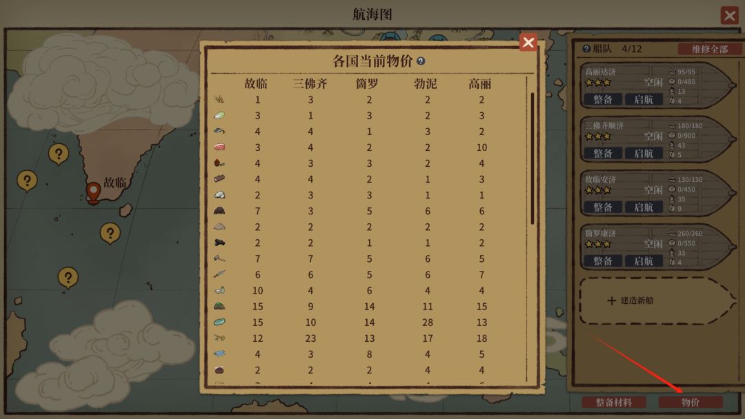- 每样物品的交易价格进价和售价是一样的,所以在海上贸易右下角点击物价就可以看到每个地方当月的物价。