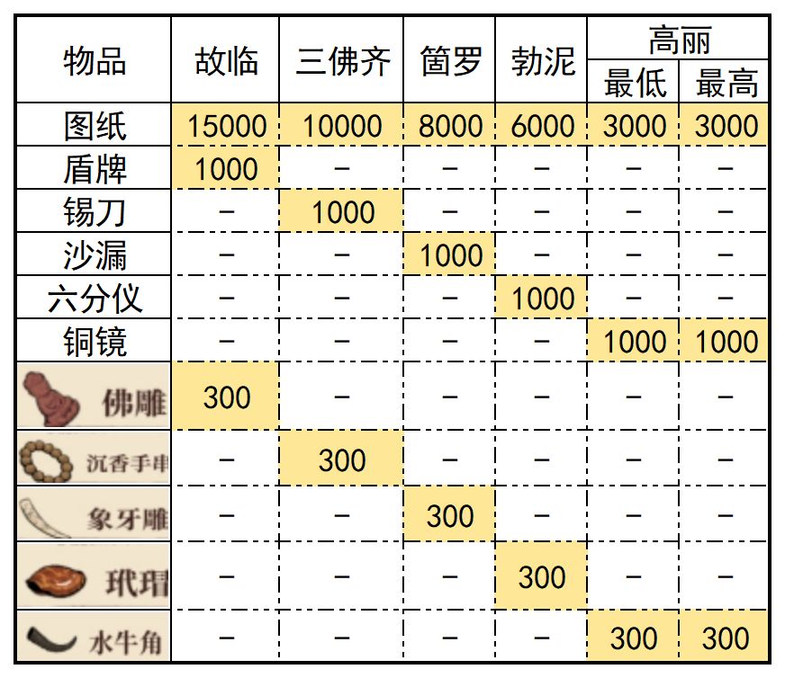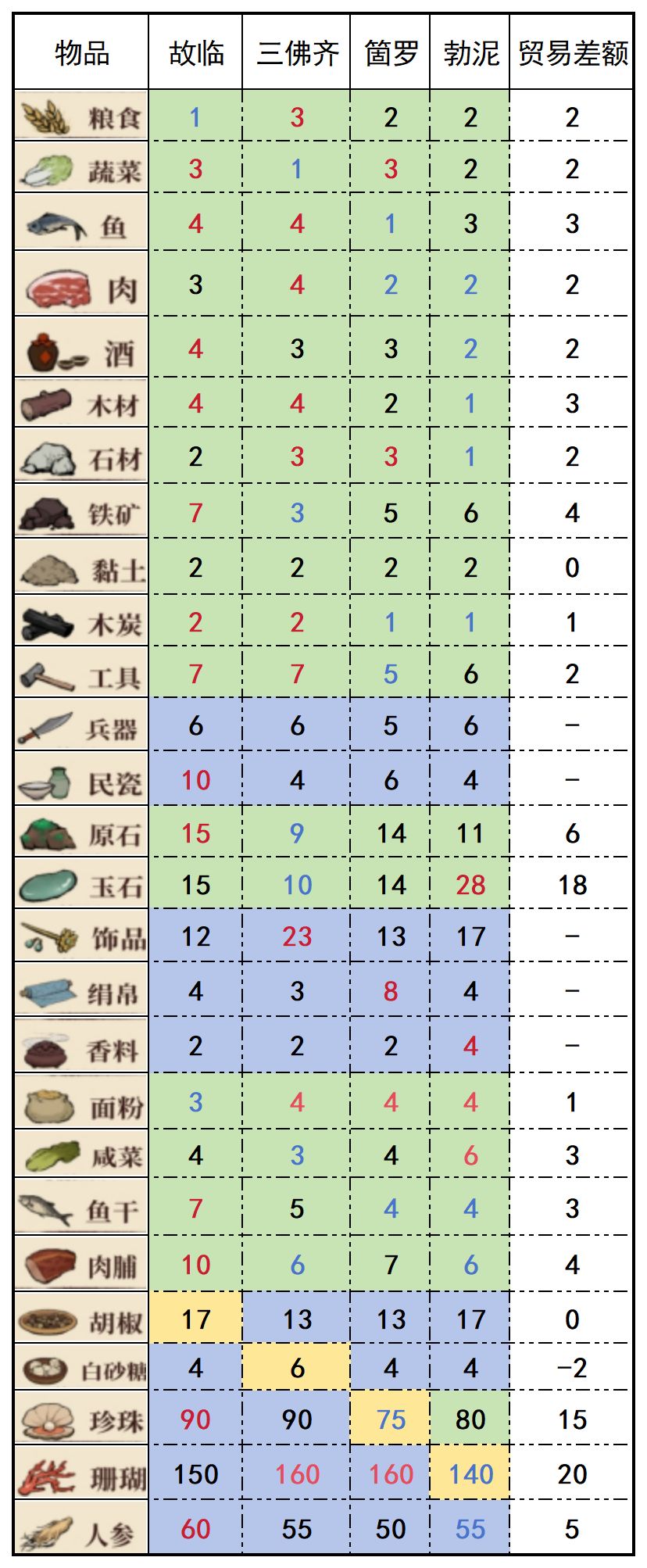 因为高丽的物品价格会随着月份浮动,所以我们分成两个版本来看,一个是没有高丽的四地常规交易版本,一个是有高丽的五地交易版本。