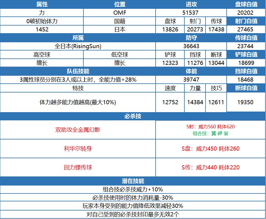 如果有盘距或者撞距加成那就更无脑了,稍微可惜了一些;比较明显的缺点就是最强射门必杀需要同时搭配葵和岬,如果不方便搭配的话,那就只能和利华尔用540射门。