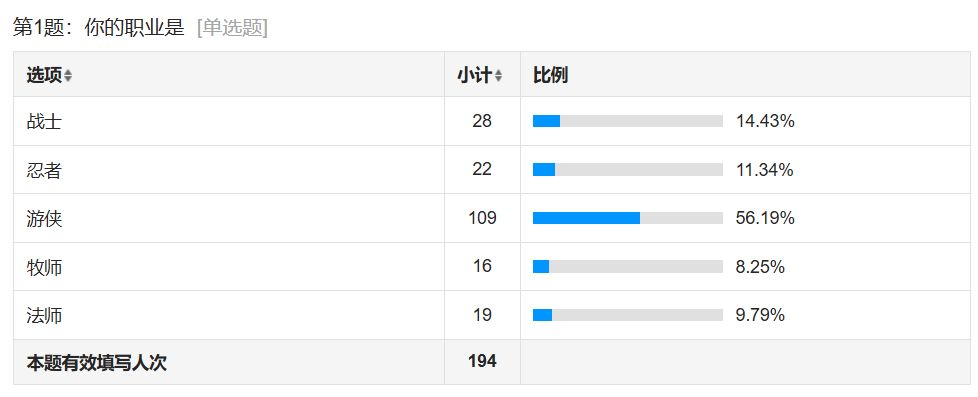 游侠玩家是本次数据统计的主题,其他四职业的人数基本持平,所以我们将后续对比分成战忍牧法四职业对比。