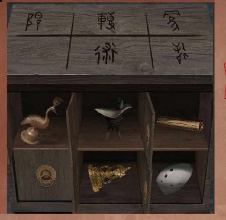 13.查看书柜,铜鼎,陶俑,壁灯和香炉上的花纹结合书上分类得到符文与类型的对应关系,根据符文与物品类型对应关系调整物品位置,在祭坛的左边的右边柜子,答案如图所示: