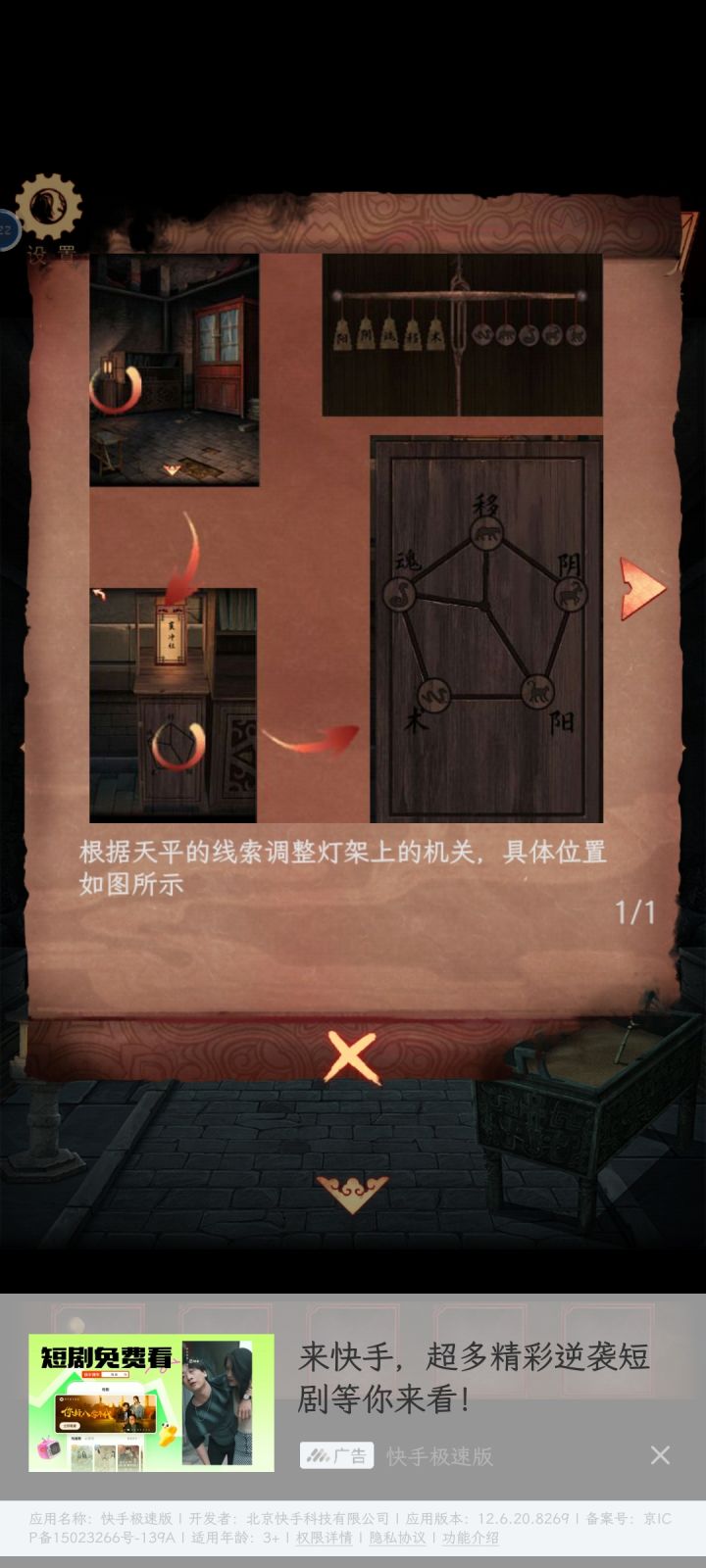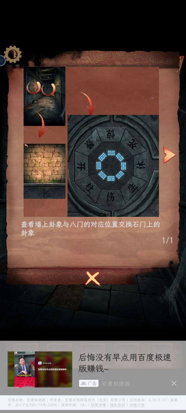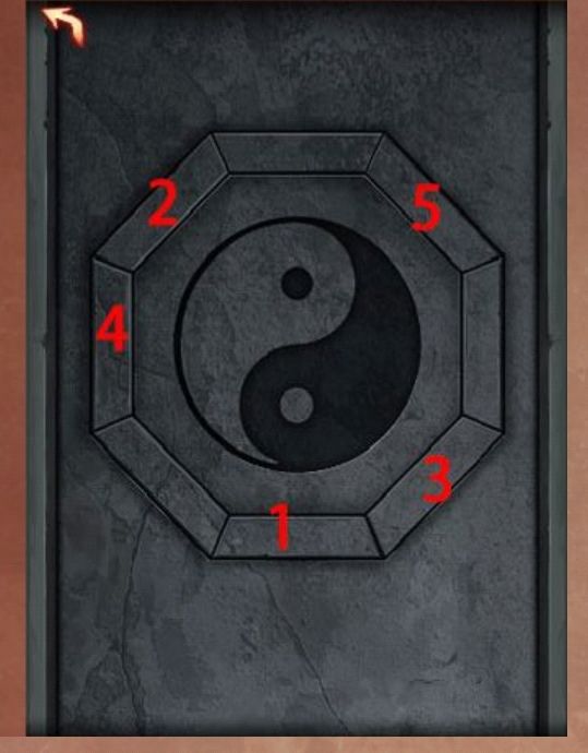 18.从第六张图片中柜子中拿到纸条,查看铜镜上面的卦象位置,结合纸条得到卦象按下顺序,根据线索按顺序按下石门机关,顺序如图所示: