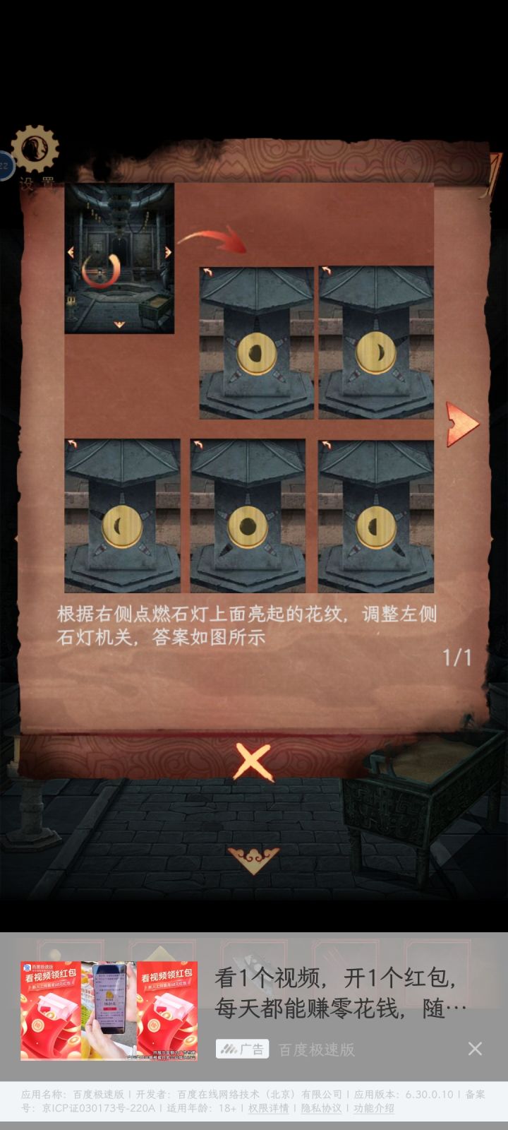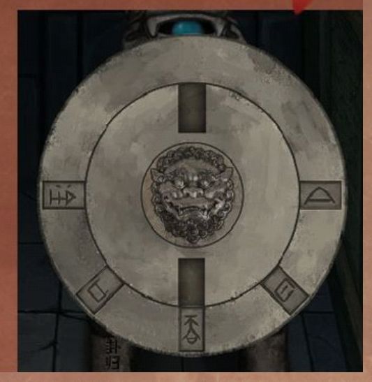 11.将小木槌放到像托塔天王的宝塔旁边陶俑的手中,根据陶俑鼓上的花纹调整门口的镇墓兽胸口的机关,答案如图所示:
