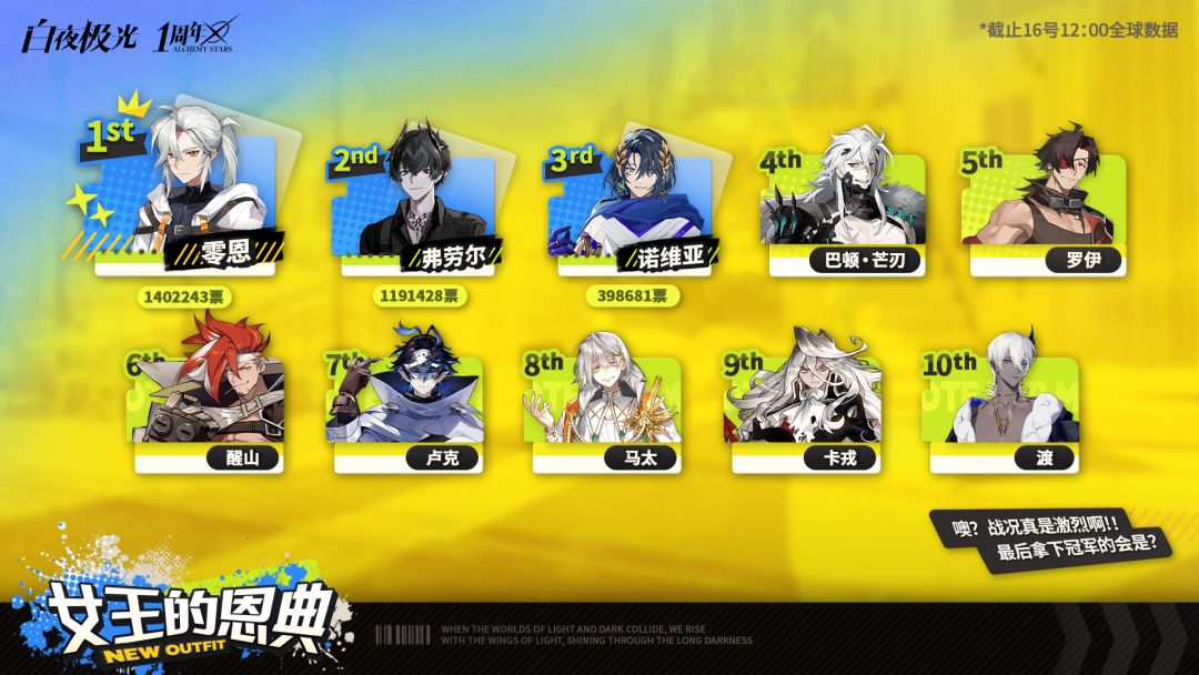 上周开启的新一期时装投票活动,相信各位都有参与其中,导航员珍贵的心意券送给了哪位光灵呢?截止16日北京时间12:00,全球投票统计情况如下,继续为你支持的光灵摇旗呐喊吧!