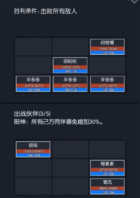 第二战第一阵敌人信息,3平多多+田+小何,由于敌方有三个平多多,所以我们这里也需要上个奶妈,且平多多和田伯纶都是主打前排,所以要上个扛得住侠客胡旭,最后再加一个输出保证萧大哥拳的力量就完事了。