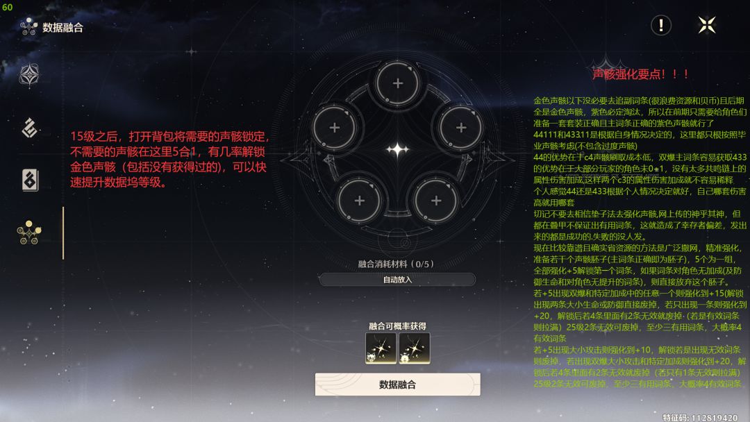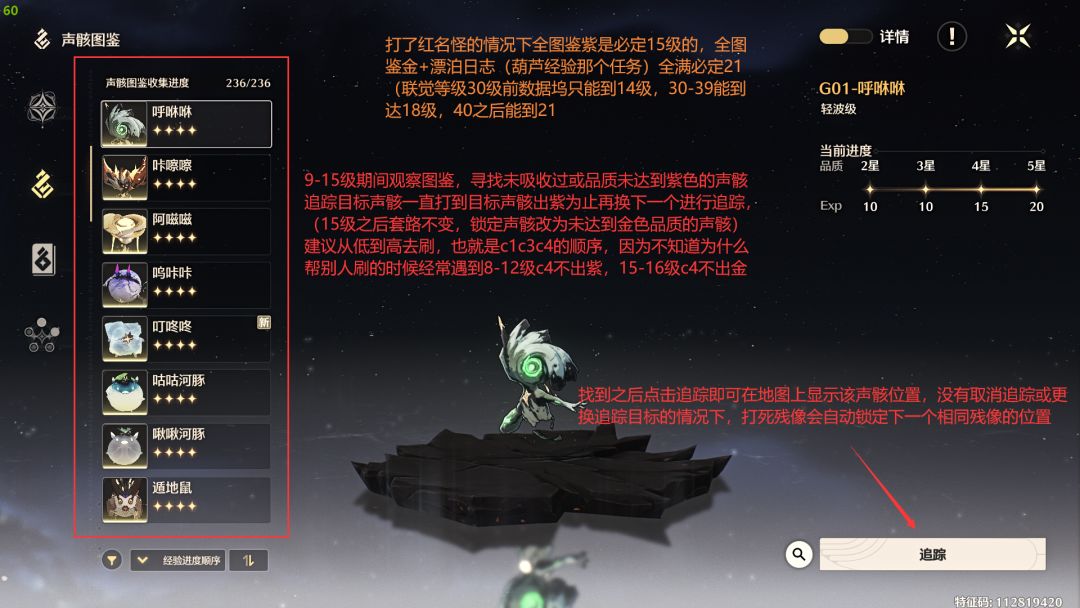 1-20级:主要以过剧情为主,20级之后数据坞等级大概在8级以上,声骸掉落最高品质为紫色,此时在追求图鉴全紫的同时可以去凑一套主c的紫色声骸(主词条对就行,副词条拉满,这个阶段不必去追求双爆双攻击,优先提升主c伤害)