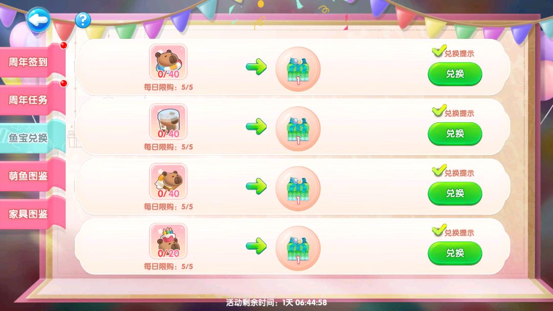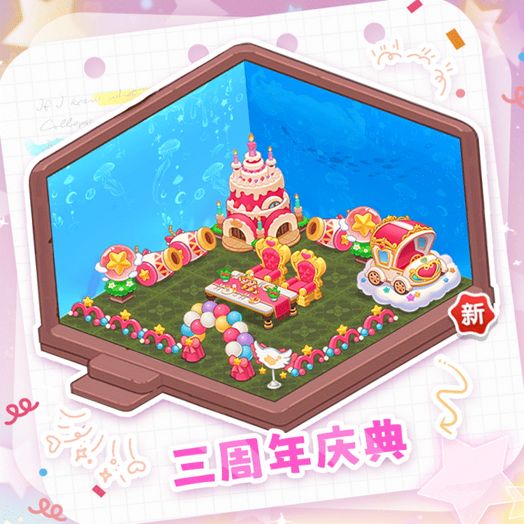 让自家水族馆变成游客绝佳打卡圣地,周年系列家具可得努力收集,解锁全部任务数量家具自选礼包随意挑选,还有家具烟花、庆典欢迎框也能拥有哦~