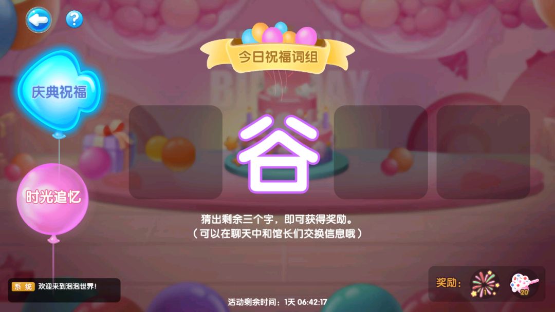 活动中每日刷出祝福词组,根据提示猜出剩余三个字,即可获得家具烟花及蛋糕发夹奖励(每日重置)。