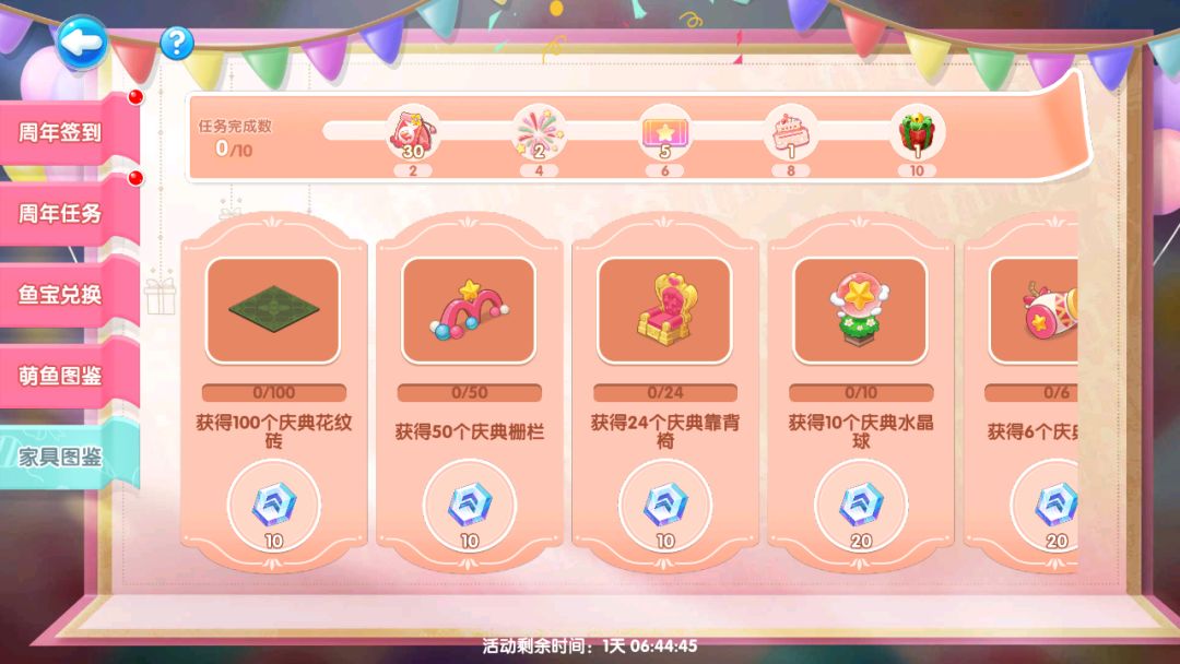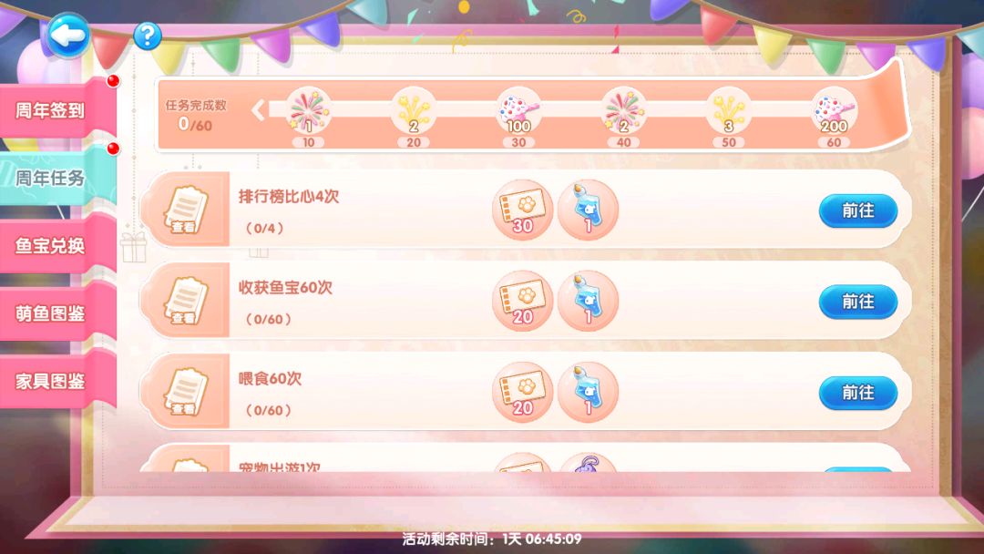 完成周年任务即可领取周年手册经验(用于周年手册进度)和游戏道具,完成指定任务数量还可额外解锁萌鱼烟花、蛋糕发夹奖励哦!