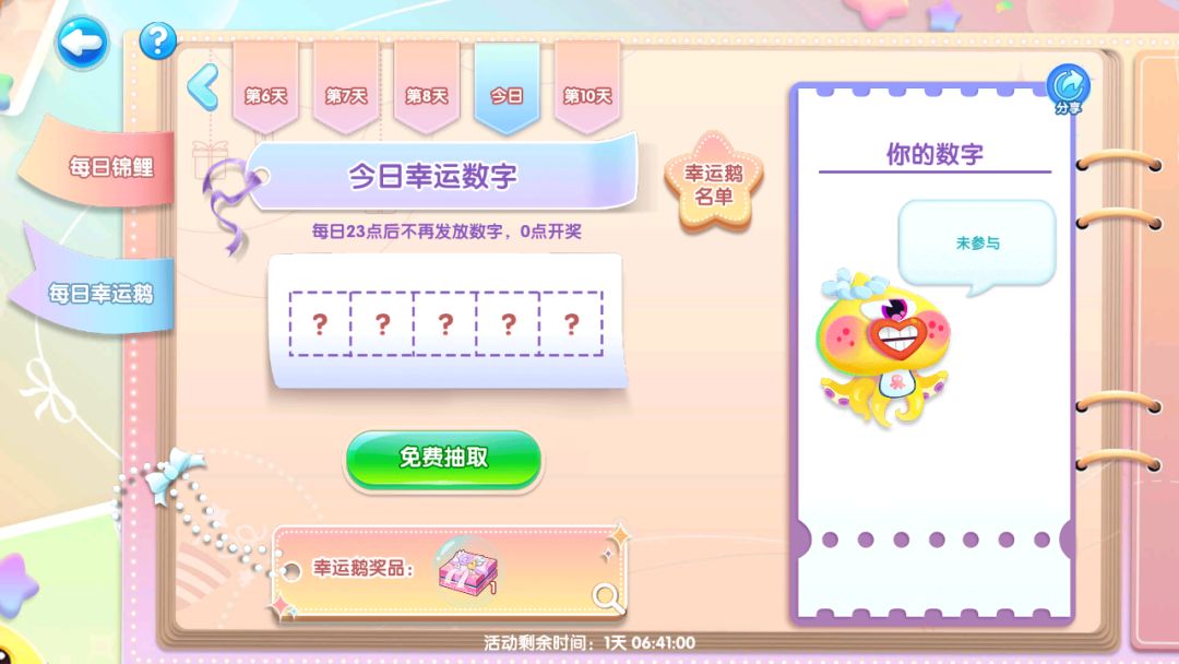 获取数字:每日登录时馆长会收到一组免费数字,也可以通过购买礼包解锁多组数字,每日23点过后不再发放数字哦!周年梦幻启程,萌鱼推出全新实物周边,参与每日幸运鹅抽奖,有机会获得周边奖励~