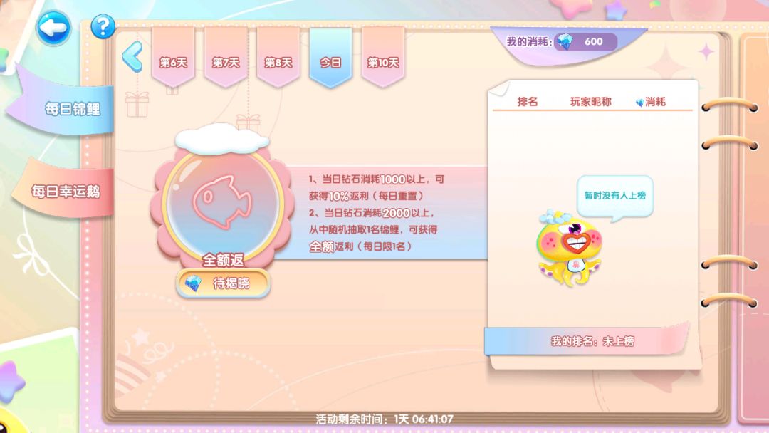 蹭蹭锦鲤接好运,活动当日消耗的钻石达1000以上可以获得10%返利,当日消耗2000钻石以上,将从中随机抽取1名锦鲤馆长,当日消耗的钻石全额返还(锦鲤奖励的馆长,不会再额外获得返利奖励)!