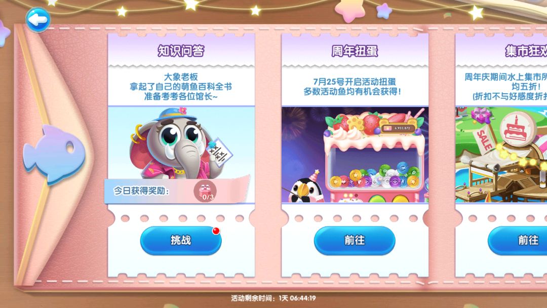 周年惊喜轮番上演,多种活动等你参与,有趣的萌鱼问答、超值集市折扣以及可爱的活动鱼通通安排!