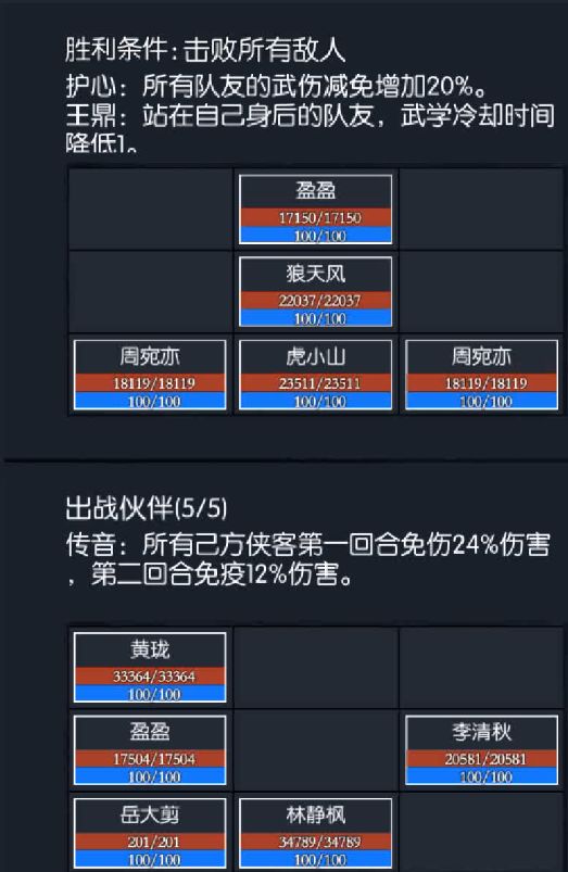 阴阳隙第三层第四战,先看第一阵,中间一列人最多,有虎小山保护相邻队友,两周打最远的目标。有狼扣内力,也是打最远目标。先把我们高练度小林子,放在最中间甩剑。上黄珞做嘲讽盾,打最前排,回友方内力,顺便减益对面。盈盈给全队增伤和对面互相抵,大剪放后排,快速启动小林缺剑术。保险起见再补一个肉:清秋。