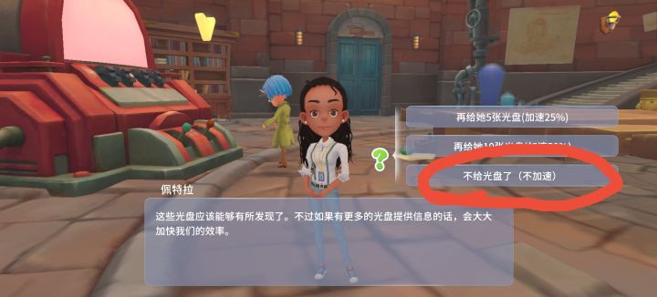 给光盘以后,她会问你加速吗?我一般不加速(纯属个人意见,哈哈哈),还有一点得注意,佩特拉只在科研中心接受研究,如果在外面遇到她,她可不会接受了,科研中心开门时间是:08:00-18:00。