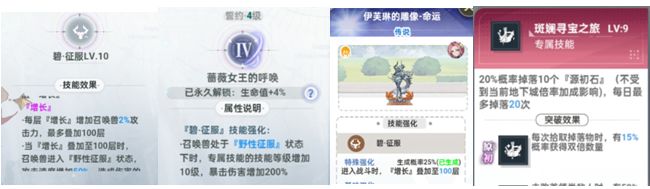 2. 伊芙琳4级契约-蔷薇女王的呼唤:召唤兽处于‘野性征服’状态下时,专属技能等级增加10级。七彩宝箱怪的专属技能,源初石掉落次数是受等级影响的。等级+10级,每日最多掉落30次。伊芙琳主战技能-碧·征服:召唤兽攻击时,为伊芙琳叠加一层‘增长’,叠加至100层时,召唤兽进入‘野性征服‘状态,专属技能+10级。伊芙琳雕像-命运特殊强化生成(生成时),进入战斗时,‘增长’叠加至100层。