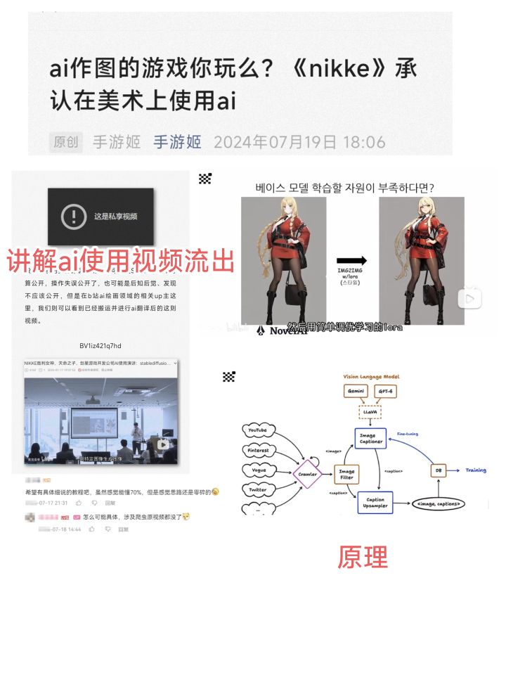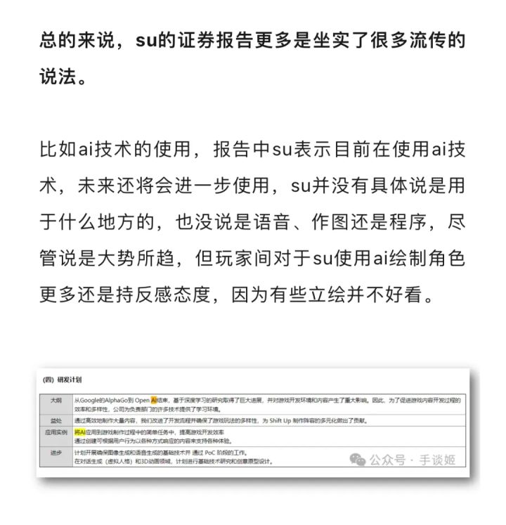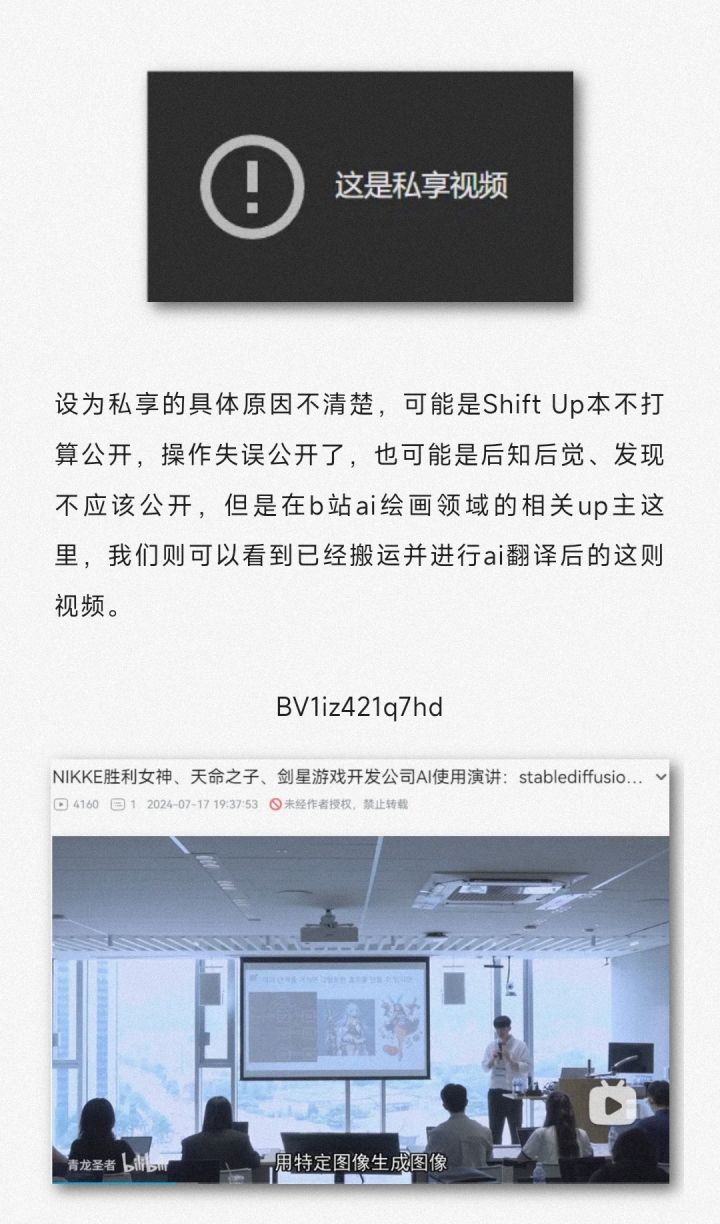 主要有一个非常有意思的地方是Shift up可能误公开过ai的使用演讲。ai绘图还是有一定的侵权风险的,所以对于游戏公司来说光是【公开分享】可能就会出问题。