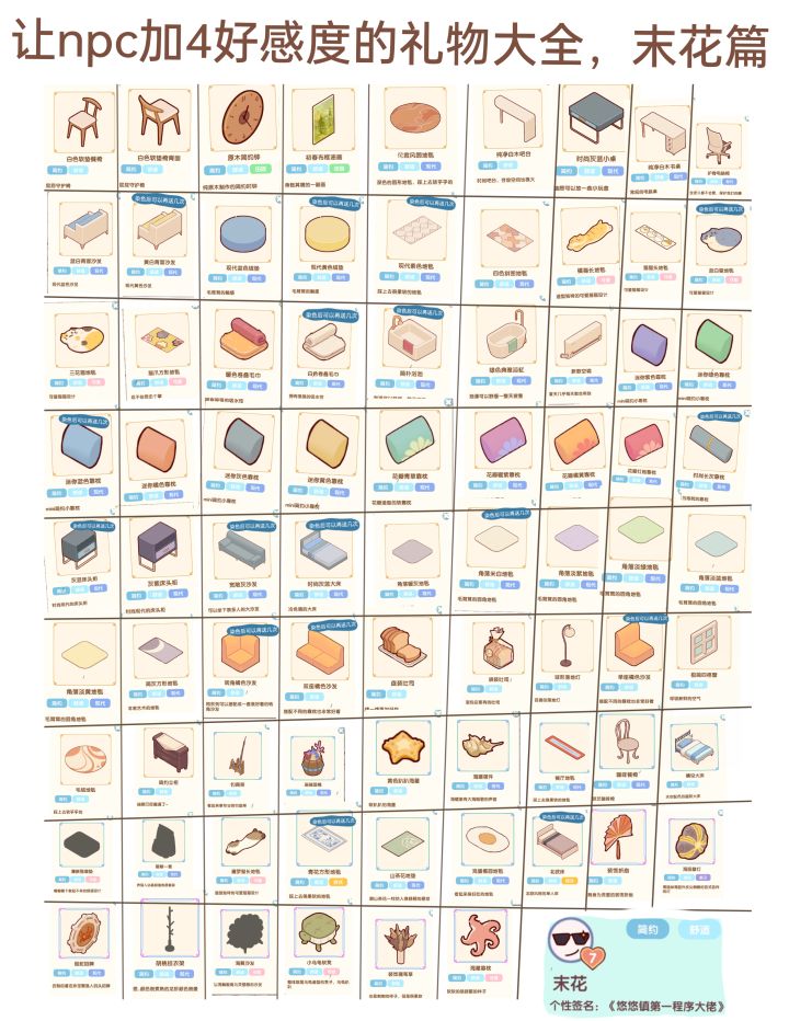 送礼物送破防了,紧急翻图鉴,整理出了给末花会加4好感度的礼物图鉴。(末花喜欢 简约 舒适 属性,送同时满足两个属性的礼物会加4好感,只满足一个属性会加2好感)