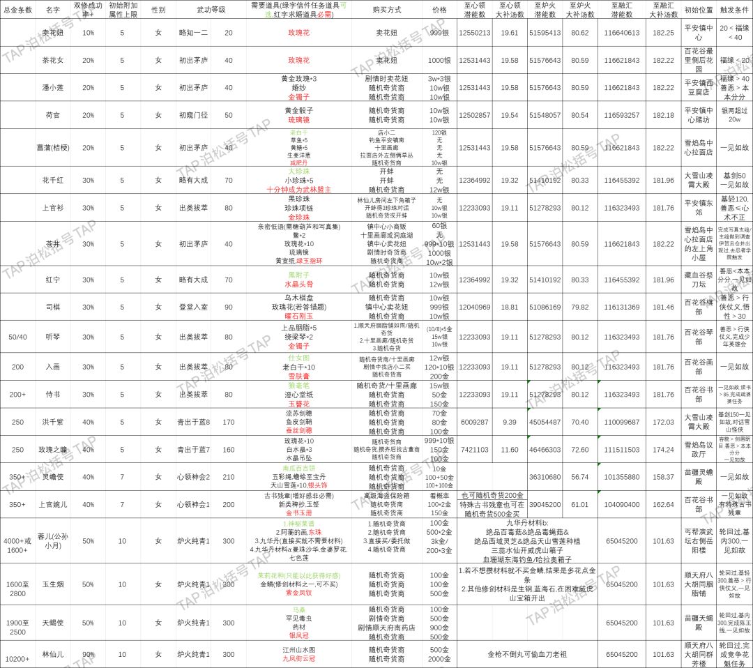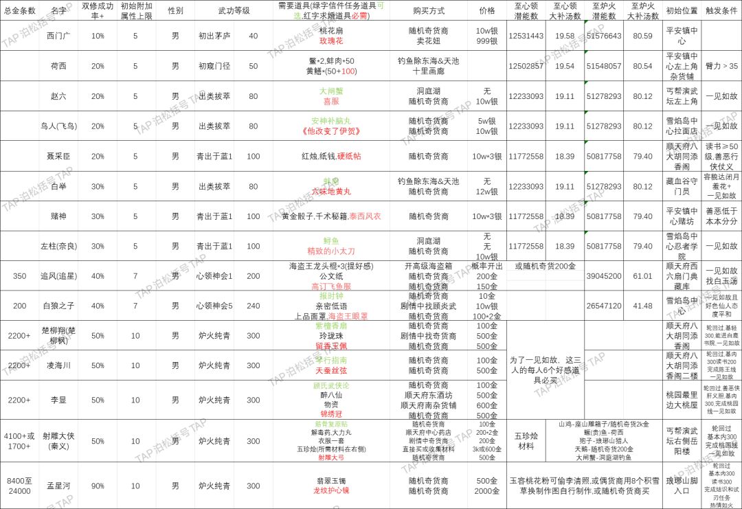 参考了好几个人的帖子,就不一一列出了(收藏数多的都有份)。并修正十全大补汤数据。炉火伴侣的信件不用去钓鱼,无量商店有炉火红娘信封可以自选信件。主要用于择偶规划,提前攒道具,因此需要与结婚攻略一起使用,尤其是林仙儿和孟星河,结婚攻略论坛随便就能搜到。触发条件是触发剧情条件,求婚必须满足热情如火大补汤要向上取整,如果19.11就是需要20个。保留小数用于衡量得失,0.11个大补汤就是0.11×64w=70400潜能,用于比较最后一个是买大补汤划算还是直接传功划算。