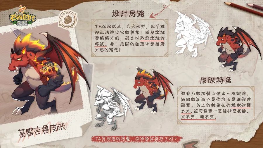 焦黑的四肢或许是葛雷吉鲁攻击力最薄弱的位置,但皮下细密的金色烈焰又似乎在告诉众人事实并非如此、千万不能小瞧Ta分毫;传言,翅膀上的空洞是脾气暴躁的TA怒目时被自己烫伤……(我们还是不要揭这只暴脾气的伤疤了)。无论如何,一切传言都抵不过TA“火不灭,魂不灭”的强大信念。