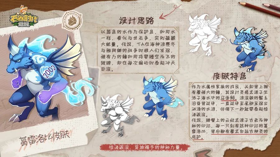 水属性葛雷洛比皮肤翅膀参考马面鲀的鱼鳍设计而成,鬃毛顺着脊背一路向下,直到尾巴都被同化成水波状,打着漩涡般的圈,不知是否用来圈禁敌人?