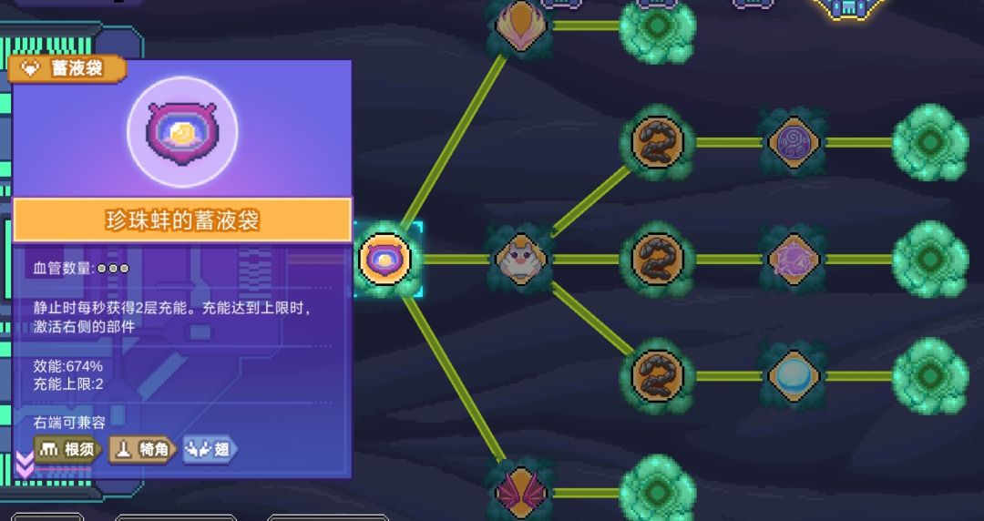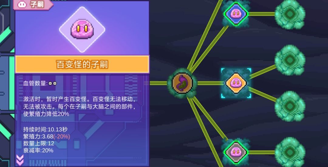 - 呼吸系统2:粘液腺接呼吸系统的逻辑是连线两端主体一起触发呼吸系统,所以最多2*n*n倍触发(由于子嗣消失到生成和生成后触发粘液腺再触发呼吸系统需要时间,所以不是稳定维持这个倍数)