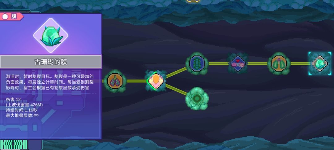 注意:由于辅助buff与debuff不可叠加,因此不需要大量触发,如果大量触发,会严重占用设备性能,效果可能反而不如舍弃辅助,多加些子嗣来加快叠层效率,图上连接方式为稳定维持debuff、多buff和debuff、降低性能占用兼顾的参考方案(如果卡了可以考虑把排泄系统去掉)