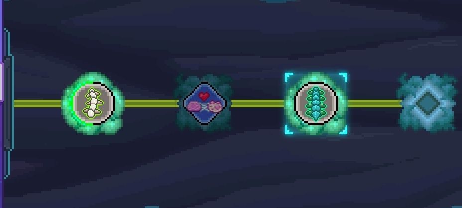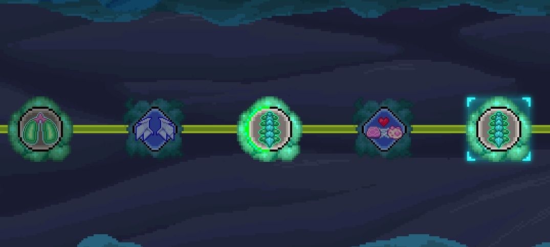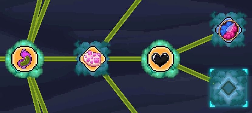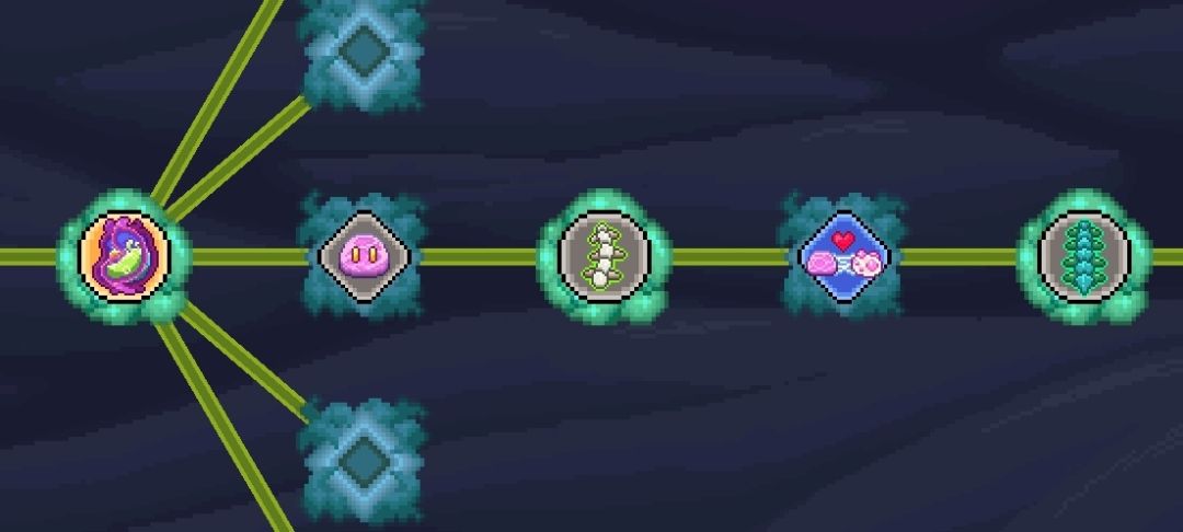 - 粘液腺:可选黑山羊的粘液腺(子嗣)或者荧光蜗牛的粘液腺(翅膀),因为子嗣都有前面的翅膀效果,所以几乎没有区别,持续时间越长越好,其他不重要;这里逻辑是让每个子嗣都与其他子嗣产生连接,假如有n个子嗣,就会产生n*n个连接(没错,粘液腺会把自身作为连接目标)