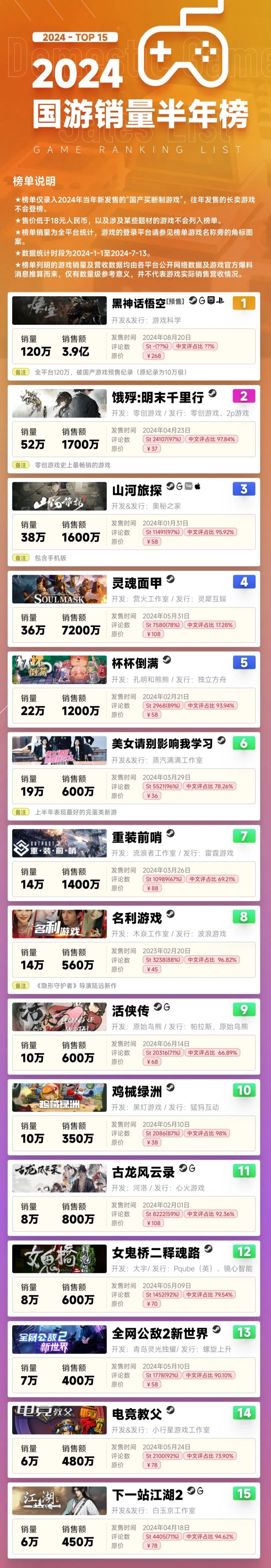 今日,国游销量吧所发布的《2024 国游销量半年榜》引发了广泛关注。其中,最引人瞩目的当属《黑神话:悟空》#黑神话悟空 #黑神话悟空预售 。该游戏自 6 月 8 日开启预售以来,其全平台销量一路高歌猛进,短短一个多月的时间便达到了惊人的 120 万套。从各平台公开网络数据及游戏官方爆料消息推算,其销售额约为 3.9 亿元,成功位列半年榜榜首。