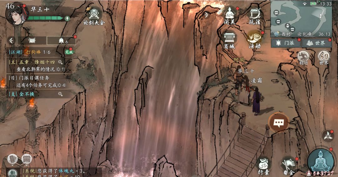 去瀑布领奖(瀑布位置如下,论剑峰入口往右走,坐标:论剑峰35_18)