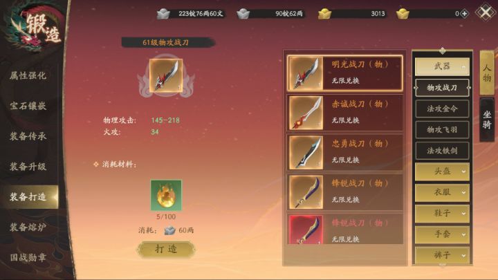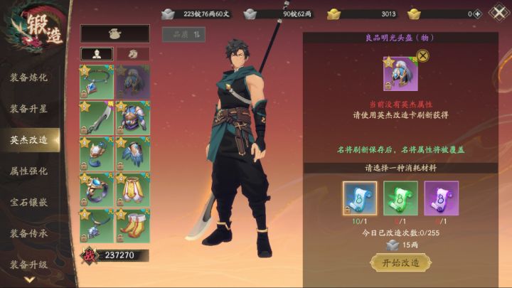 1、消耗道具英杰改造卡,提升装备属性,推荐物理类职业(战刀、飞羽)优先打造力量、物理攻击属性,法术类职业(铁剑、金令)优先智力、法术攻击属性。