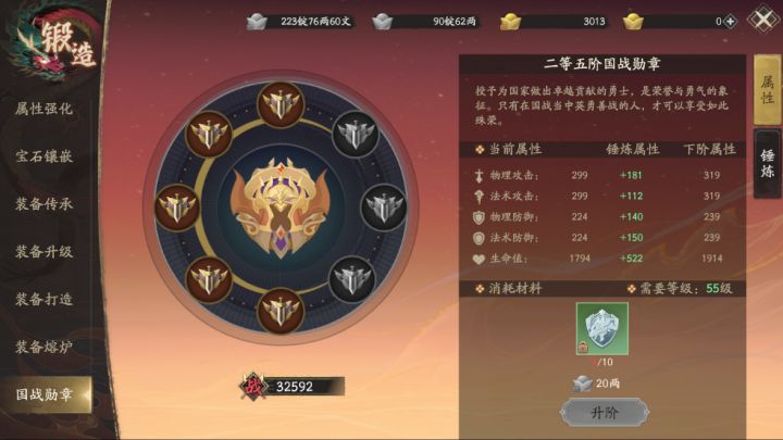 2、各种徽章可以在【锻造】界面内对国战勋章进行强化。