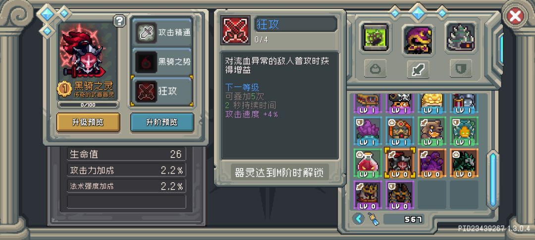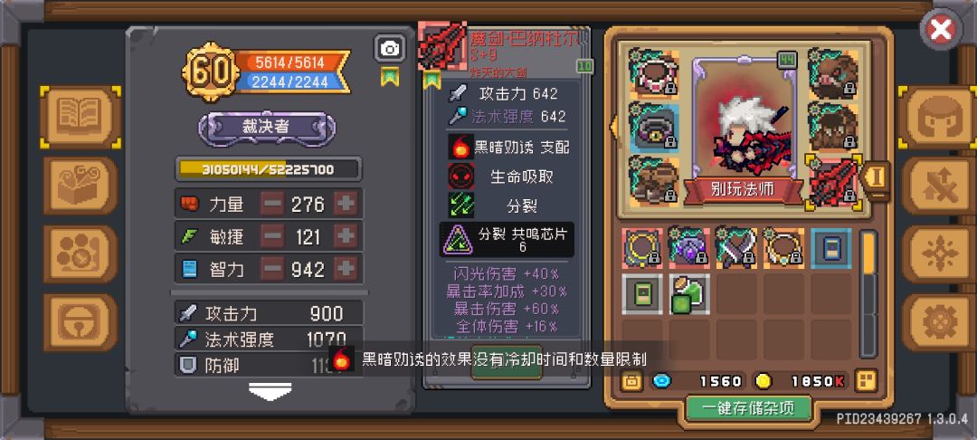 武器用黑骑士掉的魔剑,但是主羁绊对我们没用,主要因为这把剑双攻加的巨多。裁决使所有技能都是基于混伤出伤害,所以需要同时叠双攻。