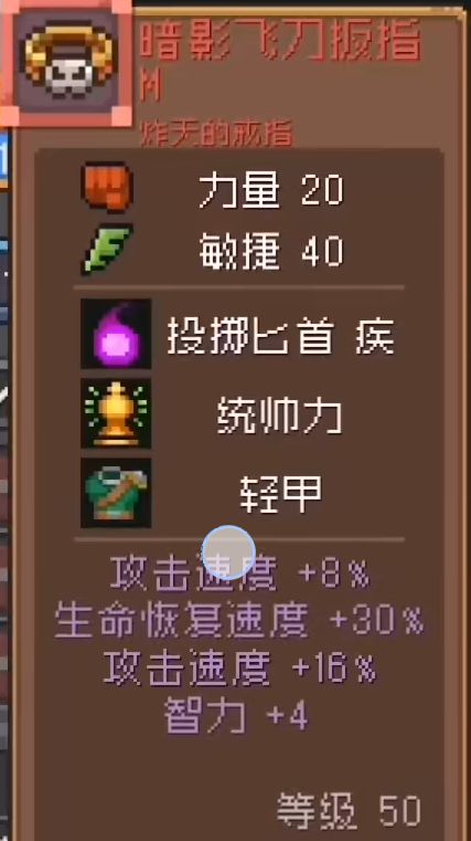 戒指用骷髅王掉的那个红色戒指,可以自动回收飞刀,不用跑去捡了(我还没刷到,偷的别人的图);