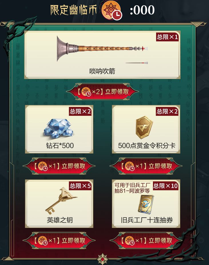 在7月15日开放了限定幽临币区的兑换,不过玩家需要邀请一位6月登录但7月未登录的玩家登录游戏,可获取一枚限定幽临币,同时被邀请的玩家也可以获得一枚限定幽临币,之前的高级幽临币是无法兑换的哦,玩家可用限定幽临币兑换五个限定奖励道具,分别是唢呐吹箭、钻石500*2、500点赏金令积分卡*2、英雄之钥*5和旧兵工厂十连抽券*10,我们来详细分析下限定幽临币区的几个奖励吧。