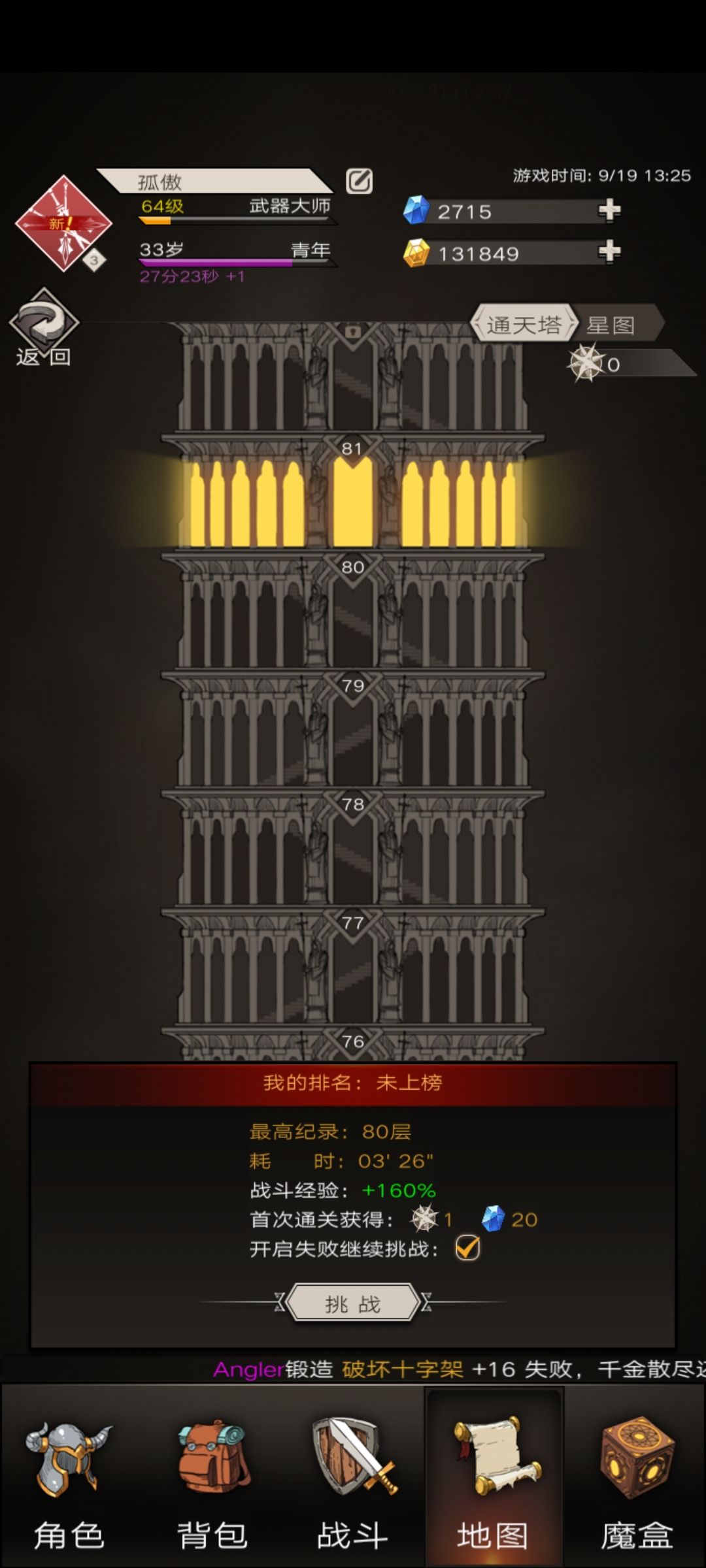 现在通天塔是81,人物六十四,世界69。兵装是三星。