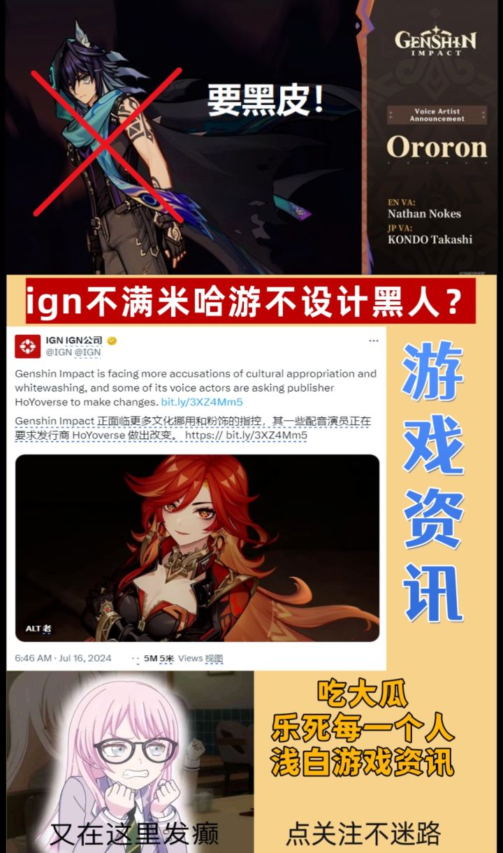 事情的起因是,最近原神的新版本正式公布,随着新版本亮相的还有火神以及马拉尼、卡齐娜和基尼奇的公布,不想却在外网迎来了惨烈的抨击。由于一众原神英配CV非常默契的下场跟团。一下就引起外网的广泛讨论。