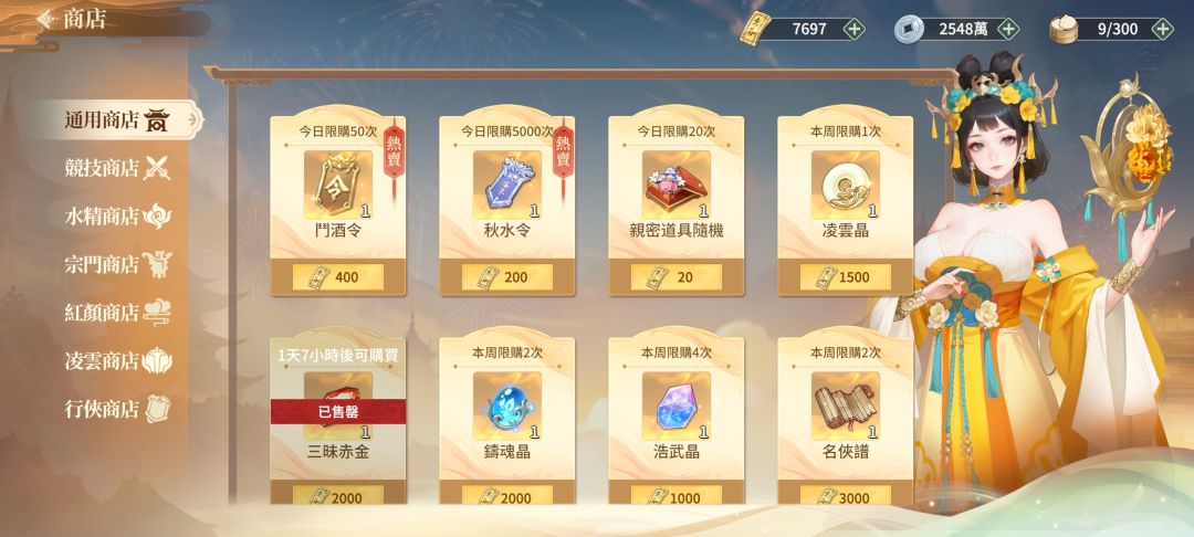 通用商店全部需要金券购买,前期我只推荐购买少量招募令,抽卡急眼是大家通病,稍微买点无伤大雅,起码抽爽了,凌云晶是角色升至绝世需要的进阶道具,暂时用不上,三昧赤金是装备锻造到彩色需要的进阶道具,这俩都可以说是急缺,但是可以通过活动来稳定收入,昊武晶与名侠谱亦是如此,前期不买,后期酌情购买,看自身紧缺情况与金券余额。
