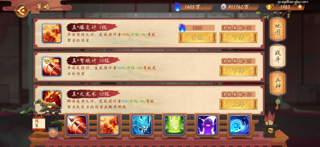 4.小火计和流水计:二选一升级即可,二者倍率一致,属性不同(对主流绝大部分武将无影响)。不用太高,前期给曹操补输出使用的单点策略,中期武力输出成型后不再使用,后期获取米妹张宁等智力输出后再继续俺需求升级即可。