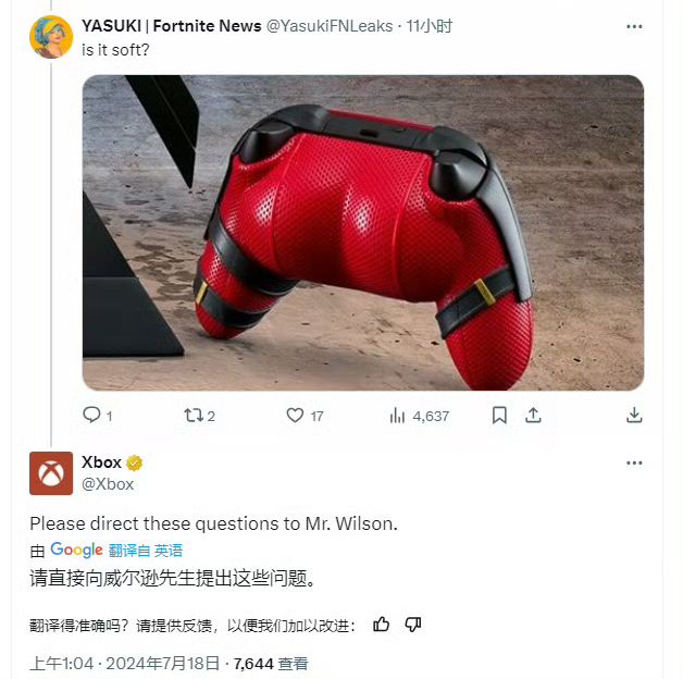 7/18号曾有网友问Xbox官方:“(手柄上的翘臀)是软的么?” 被官方回应这些问题请向威尔逊(死侍本名)提出