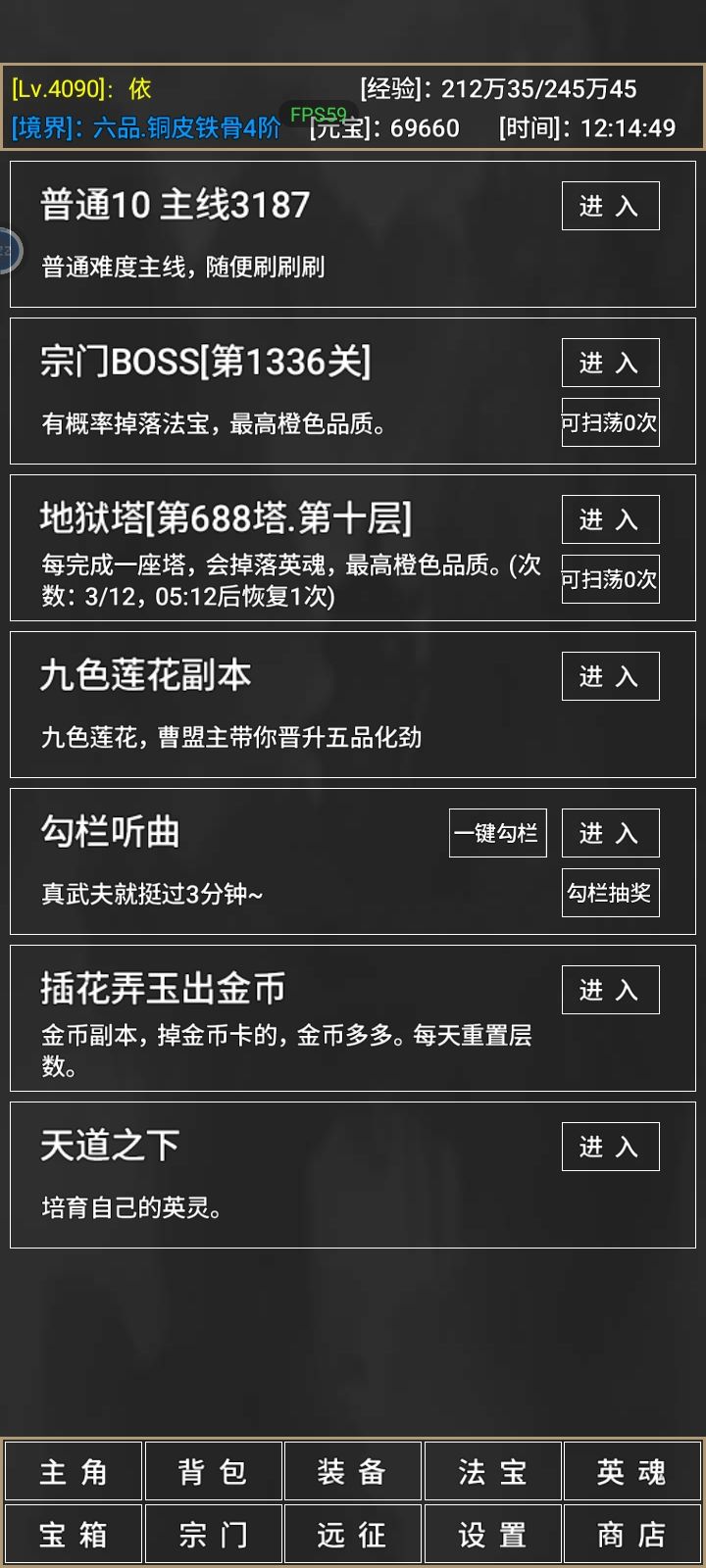 大厅里的宗门boss和地狱塔每两天可以扫荡一次可以获得大量的英魂和法宝(天道之下可以培育和收获英魂)