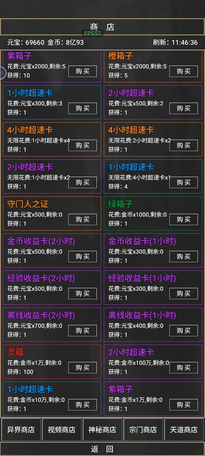 这游戏刚开始就是用加速卡快速升级和冲关,提升境界之后,商店就会刷出各种各样的东西,然后就是买金币花费的宝箱,加速卡和各种东西(特别是绿宝箱那玩意多起来能快速升级),用元宝去买收益卡(天道商店的也别忘了),存到一定限度就可以全部用掉这样会大幅度提高等级和战力。