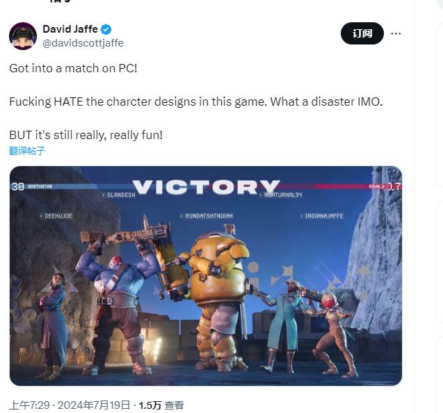 Jaffe最近玩了几局《星鸣特攻》,并在推特上分享了他的第一印象。他使用了一张胜利画面截图来批评游戏的角色设计,称其为灾难。Jaffe表示,虽然《星鸣特攻》好玩是好玩,但这角色设计简直太辣眼睛。