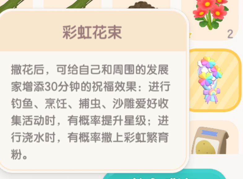 撒花后,可给自己和周围的发展家增添30分钟的祝福效果:进行钓鱼、烹饪、捕虫、沙雕爱好收集活动时,有概率提升星级;进行浇水时,有概率撒上彩虹繁育粉。