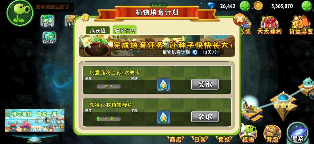 植物培育计划根本完成不了,可以看到清凉一夏中植物获得20个植物碎片已完成,创意庭院任务也是完成的,还有埃及世界里消灭20个僵尸也是完成的!但是到植物培育计划任务中进度基本没动,根本没办法完成!