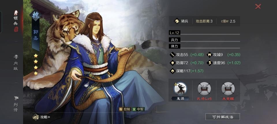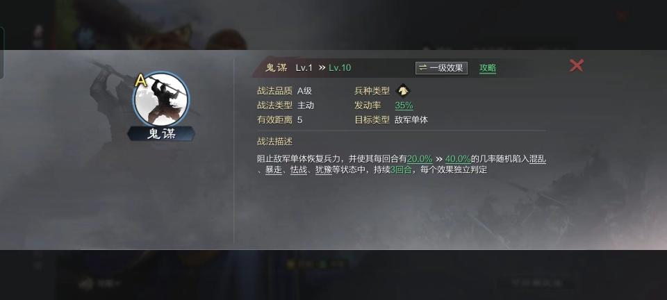 郭嘉,负面控制能力强大的中军型人才。默认专属战法鬼谋,不仅能够禁疗敌方的单体,最高等级下还有40%的概率随机给目标套上混乱、暴走、怯战、犹豫状态。如此令对手抓狂的负面状态还将持续3个回合,每个效果也是独立判定的。换言之,郭嘉给你准备的四个套餐可以换来换去,却总有一款必须吃。尽管35%的发动率不算高,却十分利于前期的轻松开荒。