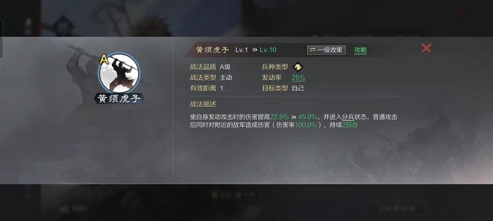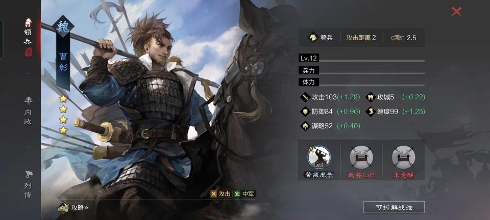 曹彰,攻击型的中军。其默认专属战法是黄须虎子,最高能让自身的攻击提升45%,并且开启分兵状态。无论开荒打野还是玩家对抗,都能对敌方的前锋和中军构成较大威胁。美中不足的是,黄须虎子只能作用在曹彰自己的身上,且这个主动战法的发动率只有25%。