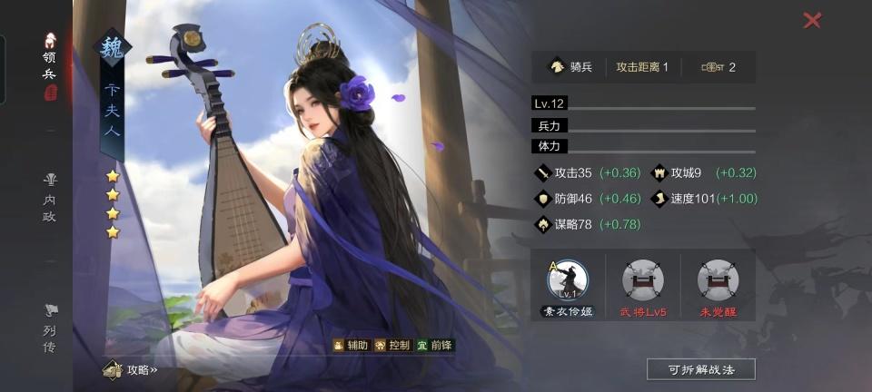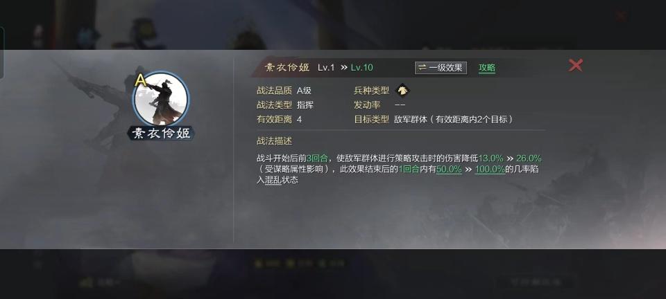 卞夫人,辅助和控制能力兼备,系统推荐她去做前锋。率土匹配给卞夫人的默认专属战法是素衣伶姬,历史上的卞夫人在委身曹操以前就是个歌姬,策划是真读过书的。可别小瞧了素衣伶姬这个技能,还是指挥型的战法,发挥绝对稳定!战斗开始的前3个回合,能让对面群体2人的谋略攻击伤害最多削减26%,之后还能再混乱1回合,对于以谋士为主体构成的敌军部队而言,卞夫人确实是相当适合挺身而出。