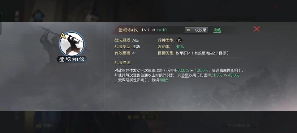 华歆,谋略输出型,系统推荐他适宜打中军位置。他的默认战法是登坛相仪,有效作用距离为4,发动率达到40%,在主动战法里也算是比较高的。登坛相仪在对敌方2人进行策略攻击之后,还可以额外附加恐慌效果。尤其在开荒阶段,敌军群体陷入恐慌能让我们更快的获得胜利。